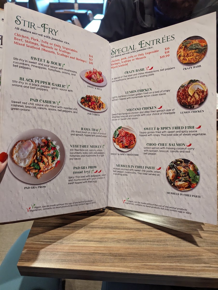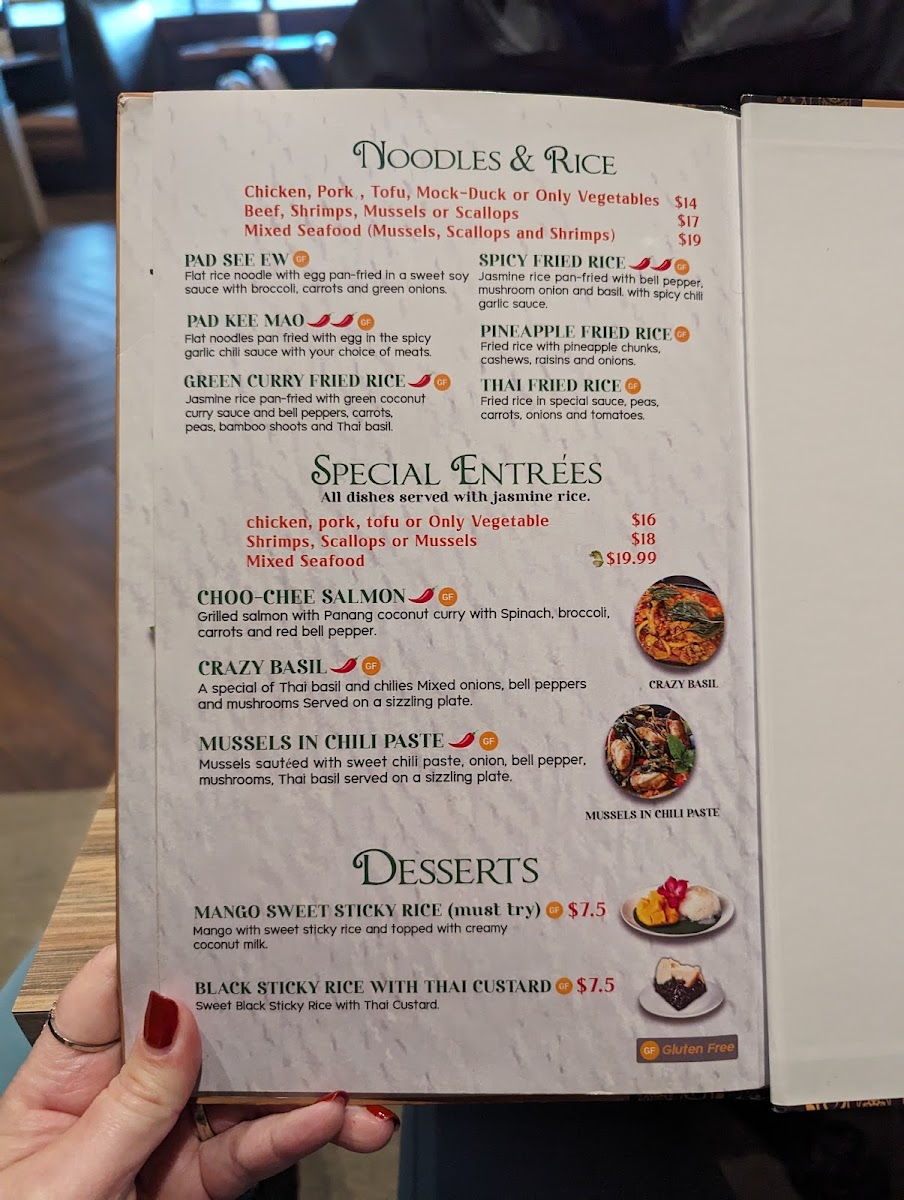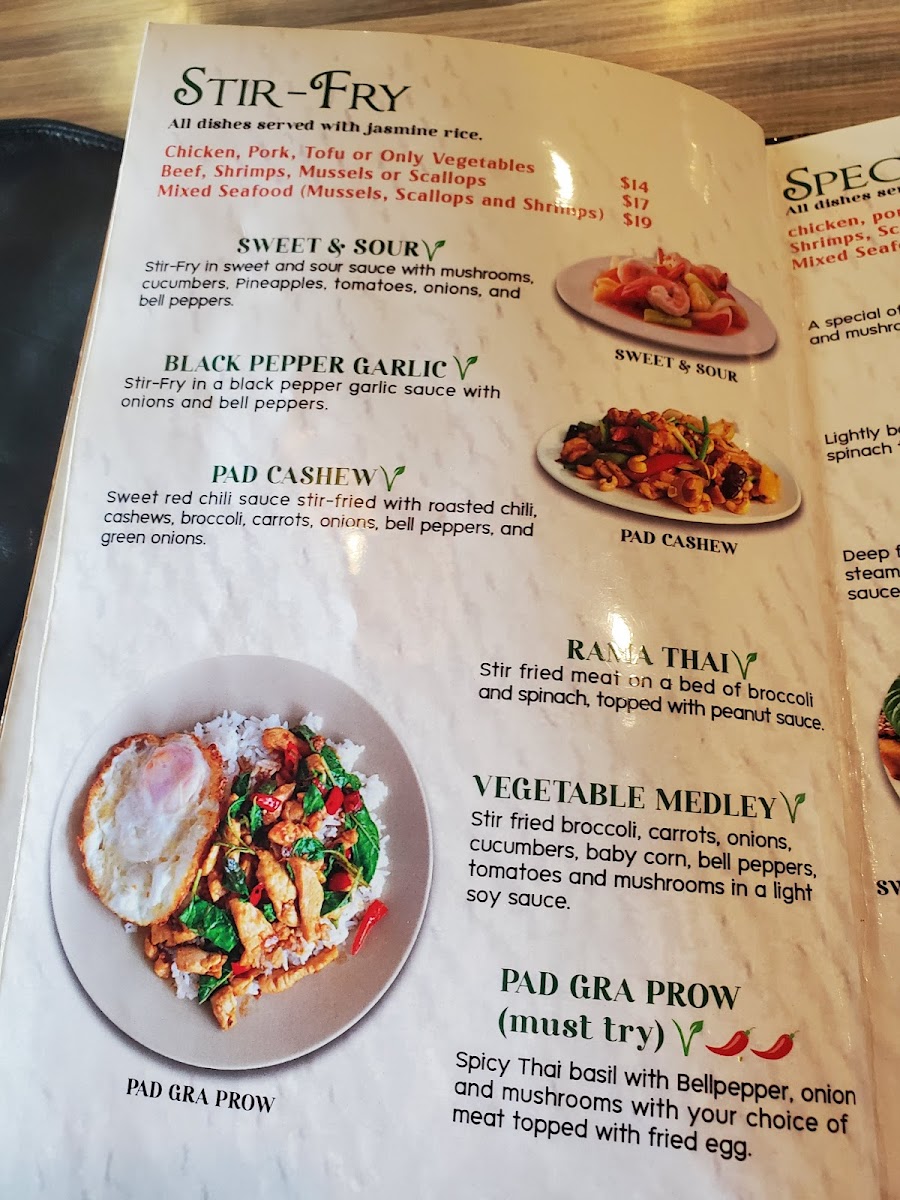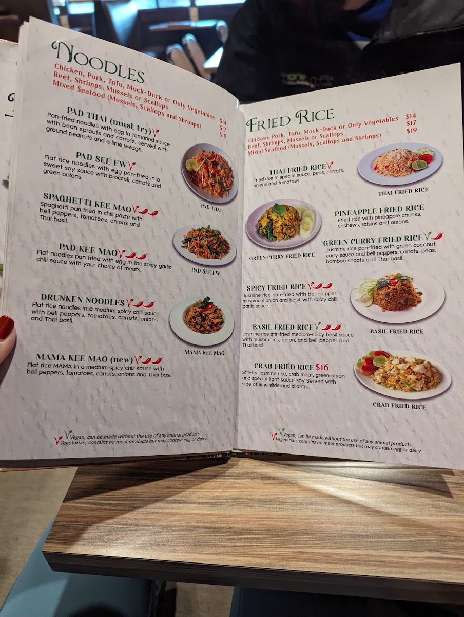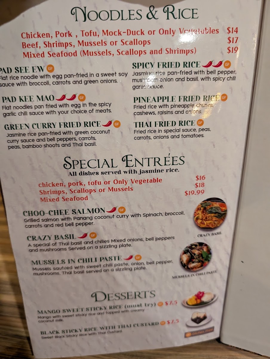 The menu is a vibrant tapestry of flavors, featuring standout items like the Basil Fried Rice and the spicy Tom Yum Goong Noodle & Fish Ball. For diners seeking gluten-free options, the ChooChee Salmon harmonizes grilled salmon with Panang coconut curry, while the Vegetable Medley offers a colorful and healthy choice.
